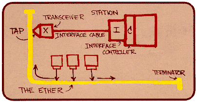 Das folgende Bild zeigt eine frühe Skizze der Struktur des Ethernet von Bob Metcalfe, als er am Xerox PARC geforscht hat (Quelle: Palo Alto Research Center). Das Memo mit der Skizze war betitelt: