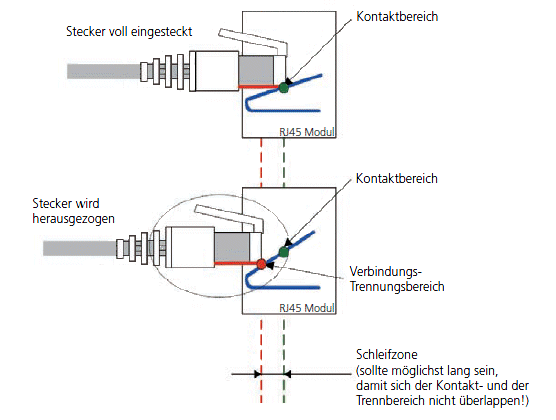 Ein weiteres Problem stellt der RJ45-Stecker dar, der ja ursprünglich nicht für höhere Ströme gedacht war. Beim An- und Abstecken unter Last werden die Kontaktflächen stark belastet. Während des Steckvorgangs verschiebt sich der Kontaktpunkt zwischen Stecker Buchse entlang der Oberfläche der Kontakte vom ersten Kontaktpunkt (Verbindungs- bzw. Trennungsbereich) zum Endkontaktpunkt.