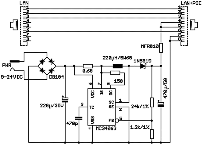 Das folgende Bild zeigt, wie man die 48-V-Versorgung für Power-over-Ethernet mittels einer Standardschaltung aus einer niedrigeren Eingangsspannung erzeugen kann. Der integrierte Step-Up-Wandler erzeugt die benötigten 48 Volt aus eine Eingangsspannung von 9 bis 24 Volt.