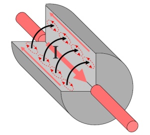 Hier kommt jedoch ein anderer Effekt zu Tage. Der "Skineffekt" bewirkt, dass die Stromdichte an der Oberfläche eines metallischen Körpers nach innen exponentiell abnimmt. Durch das elektromagnetische Feld des Stromes entstehen Wirbelströme im Leiter, durch welche ein nicht leitender Bereich in der Leitung entsteht. Der Leiterquerschnitt wird effektiv verringert und somit der Widerstand erhöht. Ein Gleichstrom I erzeugt ein konstantes Magnetfeld H. Für Wechselstrom erzeugt dI/dt entsprechend dH/dt. Ein magnetisches Wechselfeld dH/dt erzeugt seinerseits aber ein elektrisches Feld, was wieder den Strom I beeinflußt.