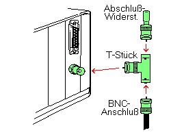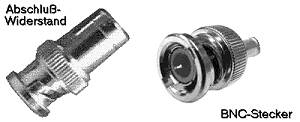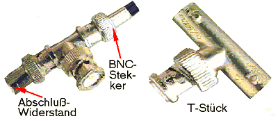 Die 50-Ohm-Abschlußwiderstände sind in BNC-Stecker integriert und werden bei den beiden äußeren Stationen direkt auf das T-Stück gesetzt. Ein Defekt im Kabel, das ja an allen Stationen über die T-Stücke angeschlossen ist, betrifft somit auch alle Stationen.