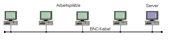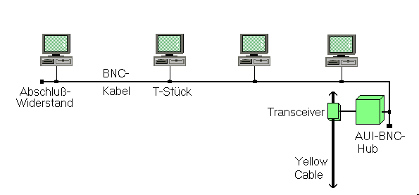 Das oben erwähnte T-Stück wird direkt an der Netzwerkkarte angeschlossen, die im Rechner eingebaut ist. Sollte es sich um den ersten bzw. letzten Rechner im Segment handeln, so wird dieser auch mit einem T-Stück angeschlossen. Jedoch wird hier der freibleibende Anschluß durch einen 50 Ohm-Abschlußwiderstand bestückt. Der Kabelanfang und das Kabelende müssen jeweils mit einem 50 Ohm Abschlußwiderstand abgeschlossen werden.