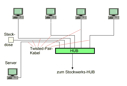 Zum Anschluß mehrerer Stationen müssen sogenannte Hubs (engl. "Hub" = Nabe eines