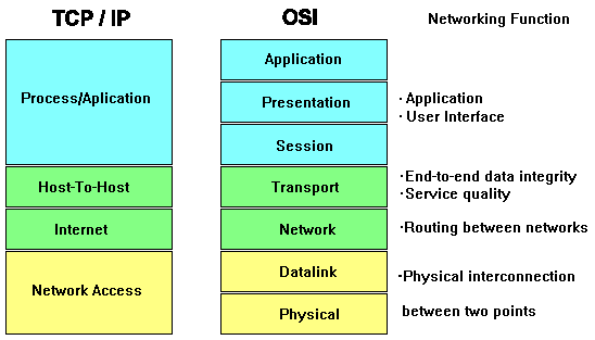 Die Schichten 1 und 2 sind gegenüber Schicht 3 protokolltransparent. Sie können durch standardisierte Protokolle (z. B. Ethernet (CSMA/CD), FDDI, SLIP (Serial Line IP), PPP (Point-to-Point Protocol)) oder andere Übertragungsverfahren realisiert werden.