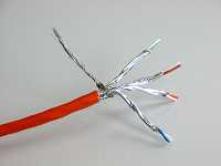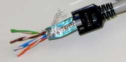 | Das Kabel wird zuerst abisoliert. Hier sehen Sie eine Kabelvariante, bei der die Adernpaare nochmals einzeln abgeschirmt sind. Die Abschirmung des Kabels und die der Adern wird nur soweit wie nötig zurückgeschlagen. Dann werden die Adern entsprechend der Farbmarkierung in die Schlitze der Leiste eingelegt. Man kann entweder erst alle Kabel auflegen und dann die Verbindung herstellen oder man bearbeitet Paar für Paar. | ![]() |