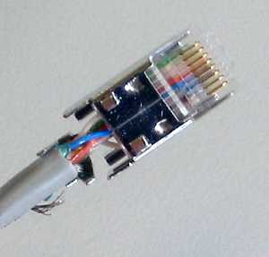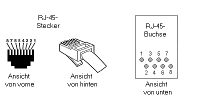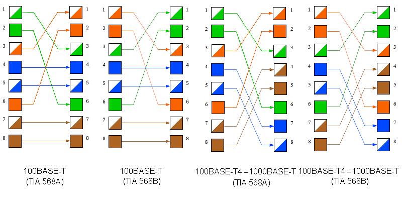 Hier gibt es zwei Belegungen (die aber bis auf die Farben zum gleichen Ergebnis führen). Man muß sich nur an einen der beiden Standards halten, damit man nicht durcheinander gerät. Normales 100BaseT- und 10BaseT-Kabel kommt mit den Adern an den Pins 1, 2, 3 und 6 aus. Die Pins 4, 5, 7 und 8 werden für 100BaseT4+ benötigt.