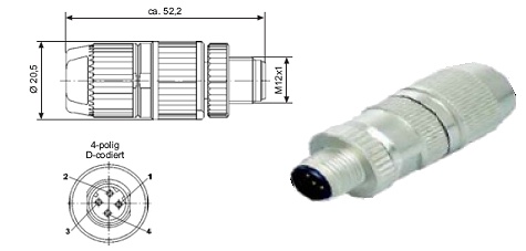 Für den IP65/67-Bereich in der Industrie kommen keine RJ-45-Stecker zum Einsatz, sondern es werden 4-polige M12-Steckverbinder mit D-Codierung verwendet. An diese Stecker kann die Profinet-AWG22-Leitung angeschlossen werden. Der Stecker ist abgeschirmt und für den rauhen Insustrieeinsatz ausgelegt.