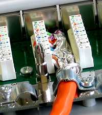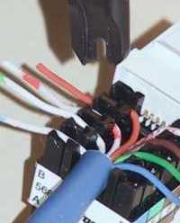 | Sind alle Adern korrekt aufgelegt, wird das Abschirmnetz zurückgezogen, zusammen mit dem Kabel unter die Zugentlastungs-Schelle gelegt und festgeklemmt. Die Schellen sind jeweils für ein Kabelpaar, so daß man normalerweise erst noch das zweite Kabel auflegt, bevor die Schraube der Schelle festgezogen wird. | ![]() |