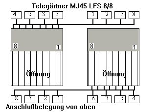 In der Regel wird das Fabrikat Telegärtner MJ45 LFS 8/8 verwendet. Die Darstellung zeigt die Draufsicht (anschlusseitig) der Dose. Die obere Klemmenreihe ist für die linke Dose, die untere Klemmenreihe für die rechte Dose. Beim Standardnetz sind nur vier Kabeladern pro Dose anzuschliessen (Pins 1,2, 3 und 6, siehe oben).