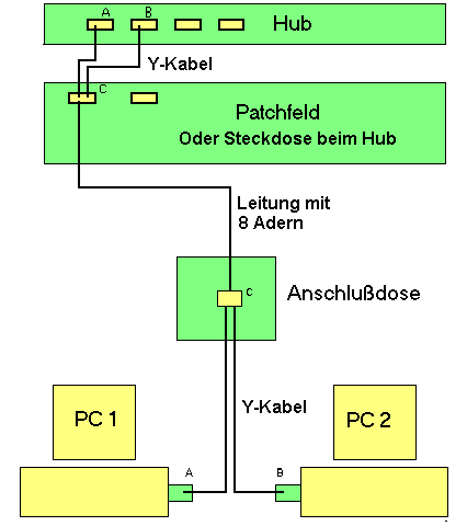 Y-Kabel sind spezielle Kabel, mit denen man ein voll ausgebautes RJ-45-Kabel, bei dem alle 4 Paare des Kabels angeschlossen sind, als Verbindungsleitung für zwei Endgeräte benutzen kann. Sinn des Ganzen ist, daß man nur ein Twisted-Pair-Kabel mit 8 Adern verlegen muß, um zwei Computer (oder andere Geräte) anschließen zu können (jedenfalls bei niedrigeren Übertagungsraten).An Ihrem Hub belegen Sie zwei Ports, die dann per Y-Kabel auf ein Kabel geleitet werden, das zu einem Verteilungspunkt (Dose im Büro) verlegt ist. Von dort wird mit einem weiteren Y-Kabel zu Ihren Endgeräten verteilen.