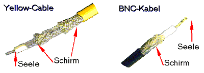 Die 50-Ohm-Abschlußwiderstände sind in BNC-Stecker integriert und werden bei den beiden äußeren Stationen direkt auf das T-Stück gesetzt. Ein Defekt im Kabel, das ja an allen Stationen über die T-Stücke angeschlossen ist, betrifft somit auch alle Stationen.