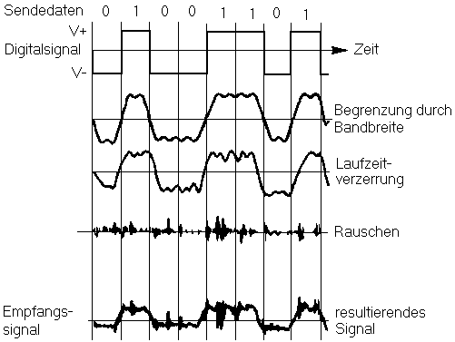 Die Geschwindigkeit, mit der ein sinusförmiges Signal in einem Medium transportiert wird, variiert mit der Freqenz. Wenn also ein Rechtecksignal übertragen wird, das wir uns als Gemisch von Sinussignalen unterschiedlicher Frequenz vorstellen, dann kommen die einzelnen Frequenzanteile zu verschiedenen Zeiten beim Empfänger an (Laufzeitverzerrungen). Die Verzerrungen nehmen mit steigender Datenrate noch zu, weil das Signalgemisch nicht homogen wie bei einem stetigen 0-1-Wechsel ist. Die Signalanteile, die durch die Flanken des Digitalsignals hervorgerufen werden, kommen häufiger vor und interferieren zusätzlich mit anderen Signalanteilen. Man spricht deshalb auch von 'Intersymbol-Interferenzen'. Diese können dazu führen, daß bei der Abtastung des Signals beim Empfänger in der nominellen Bitmitte Fehler auftreten können. Bei manchen Empfängerschaltungen versucht man diesen Fehler zu umgehen, indem der Abtastzeitpunkt adaptiv geändert wird. Die Laufzeitverzerrungen sind auch der Grund dafür, daß nicht beliebig viele Repeater hintereinandergeschaltet werden können.